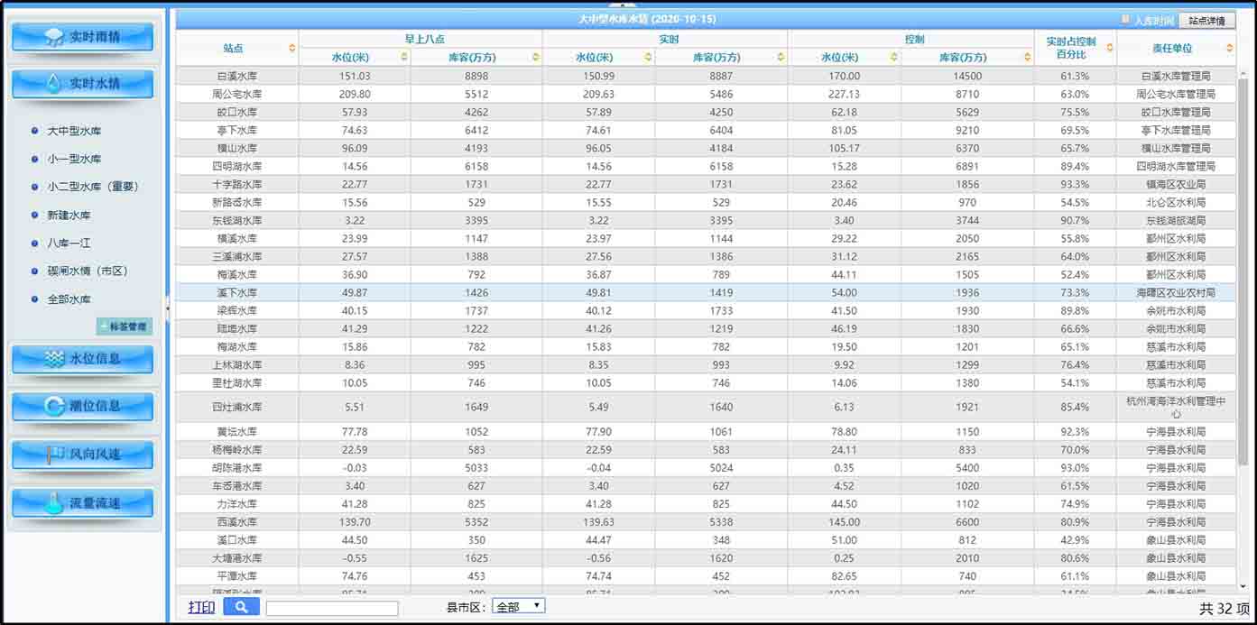 系統采用HTML5web技術,提供各類水情、雨情、潮位、流量監(jiān)測、風向風速等信息的發(fā)布、查詢、統計管理。